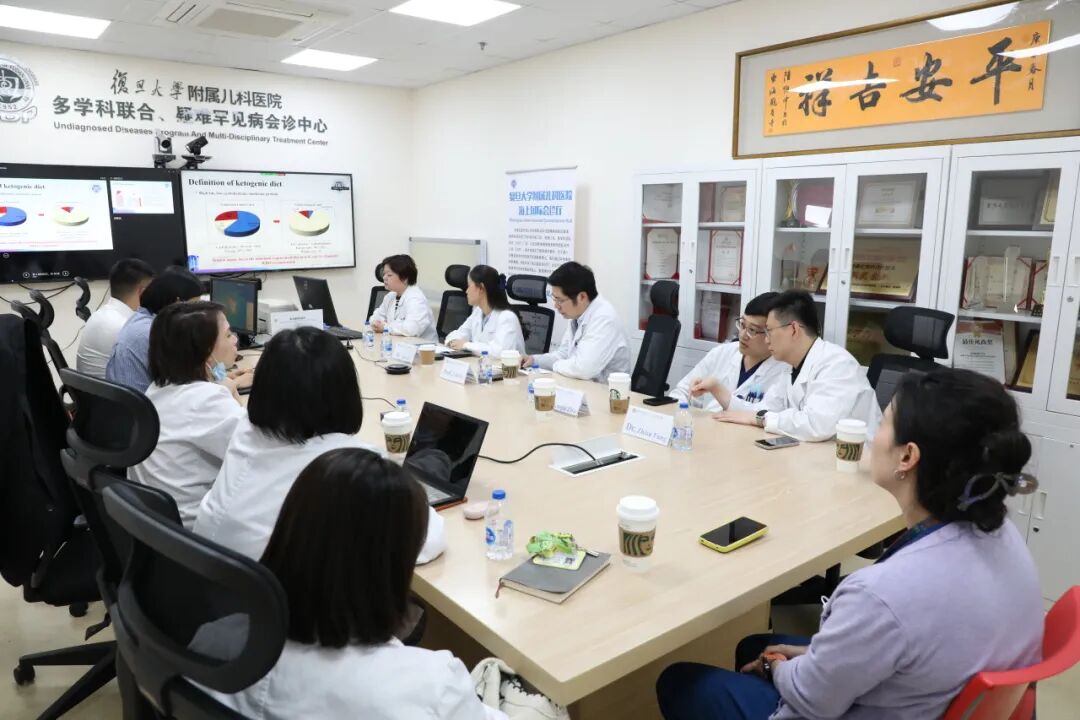 神经内科郁莉斐主任以"Clinical practice of ketogenic diet therapy for children with refractory epilepsy"(生酮饮食治疗儿童难治性癫痫的临床实践)为题展开专题讲座,分别就生酮饮食治疗的基本概念、指南与共识解读、临床实施方法及注意事项等进行详细介绍,并分享了复旦儿科生酮饮食治疗MDT团队与标准化管理模式的实践经验。神经内科李奕洁医师与临床营养科卢忠英营养师共同带来病例分享"Ketogenic diet therapy for an infant with glucose transporter deficiency syndrome"(生酮饮食治疗一例葡萄糖转运体缺陷综合征婴儿),介绍了一例表现为癫痫、运动发育落后,由我院诊断为葡萄糖转运体缺陷综合征的婴儿,通过生酮饮食治疗达到癫痫无发作并减停抗癫痫发作药物的成功案例,以及饮食实施方案的临床营养指导。神经内科方志旭医师及神经外科诸壬卿医师共同带来病例分享"The diagnosis and treatment of a case of super-refractory focal status epilepticus in a child"(一例儿童反复超难治性局灶性癫痫持续状态的诊治),介绍了一例表现为反复超难治性局灶性癫痫持续状态的Rasmussen脑炎案例,包括其临床表现、脑电图特征、影像学特点及诊断治疗等。此外,在专题讲座及病例分享环节之间也穿插了现场讨论与答疑,双方进行了热烈的交流互动。